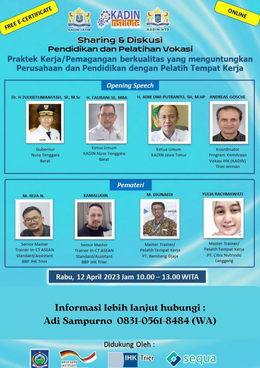 Untuk kesekian kalinnya Kadin Jawa Timur mengadakan soslialisasi Pelatihan Pelatih Tempat Kerja Internasional versi Dasar atau yang dikenal dengan Seminar AdA Start. Kali ini acara diselenggarakan oleh Kadin Jatim bekerja sama dengan Kadin Nusa Tenggara Barat. Pelaksanaan acara ini sejalan dengan semangat Perpres no. 68 tahun 2022 tentang Revitalisasi Pendidikan Vokasi dan Pelatihan Vokasi.