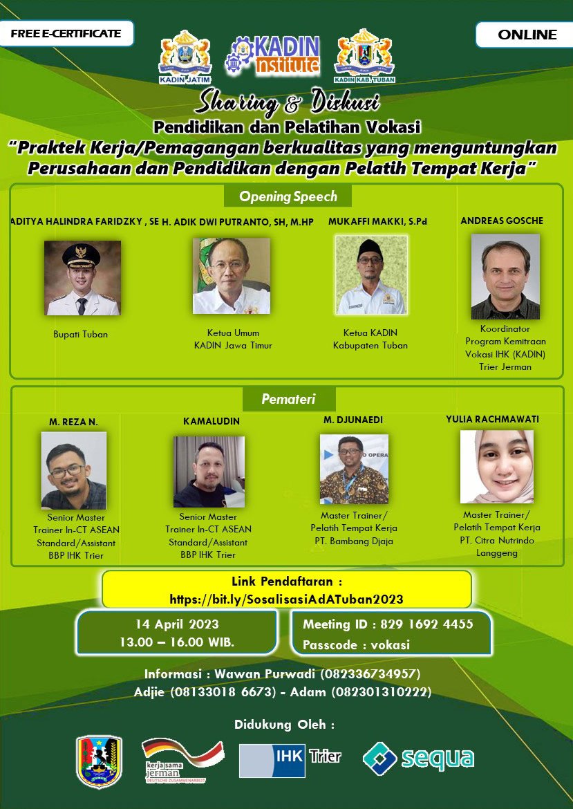 Sosialisasi Pendidikan dan Pelatihan Vokasi Sistem Ganda (AdA Start) diselenggarakan oleh Kadin Jatim bekerja sama dengan Kadin Kabupaten Tuban. Pelaksanaan acara ini sejalan dengan semangat Perpres no. 68 tahun 2022 tentang Revitalisasi Pendidikan Vokasi dan Pelatihan Vokasi.